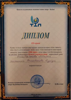 Russian language contest "Oi Sana" was held in accordance with the action plan of the state program for the implementation of language policy in the Republic of Kazakhstan for 2020-2025 in order to stimulate and develop the Russian language among young people with the Kazakh language of instruction. Aigelia Uzakbergenova, a 3rd-year student of the АКТ-23/11 study group of the Kazaly Transport and Technical Higher College, took the prize III place. The head is a teacher of Russian language and literature, a teacher-expert Utembetova Nurgul Tolepbergenovna.